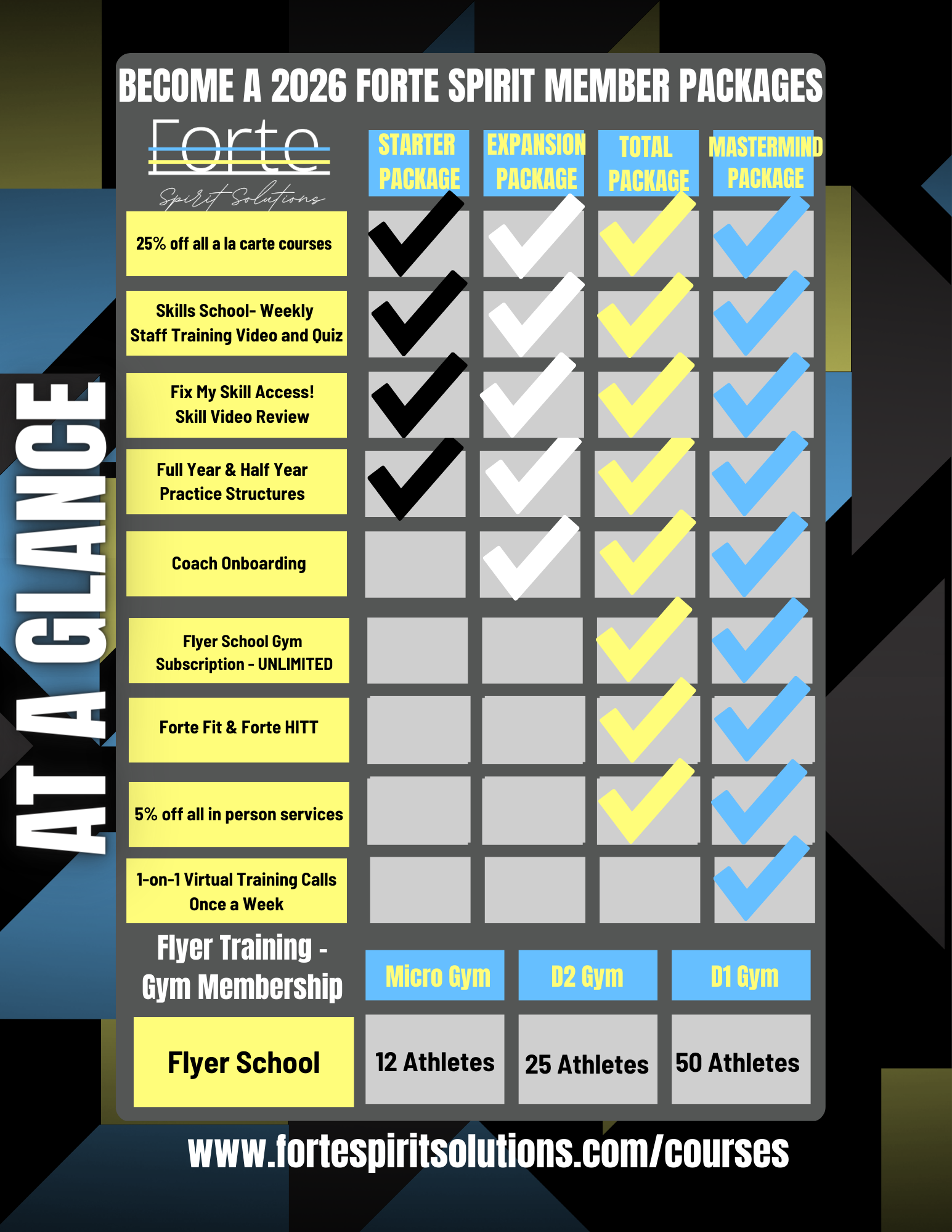 Our staff trainings includes all levels from 1-6 and have a wide variety of topics on both stunting and tumbling. Our flyer trainings can benefit anyone even if they are NOT a flyer!